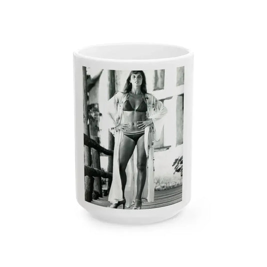 Caroline Munro #408 - 8x10 B&W Full Body in 2-Piece Bikini Photo Re-Strike from 1977 (Vintage Female Icon) White Coffee Mug