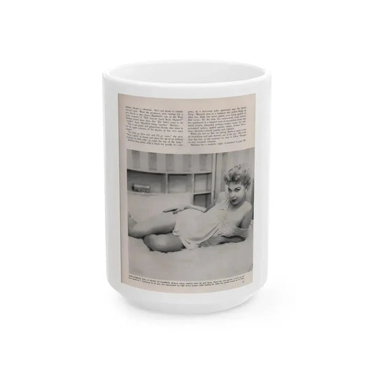 Barbara Nichols #410 - 1 Page, 1 B&W Photo & Article Continued from Modern Man Mag. Sept. '56 (Vintage Female Icon) White Coffee Mug