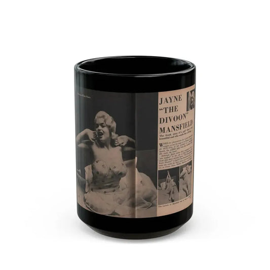 Jayne Mansfield #270 - Pages 1 & 2 of 6 with, 3 B&W Photos & 1 Large Color with, 3 Captions from JEM Magazine May '57 (Vintage Female Icon) Black Coffee Mug