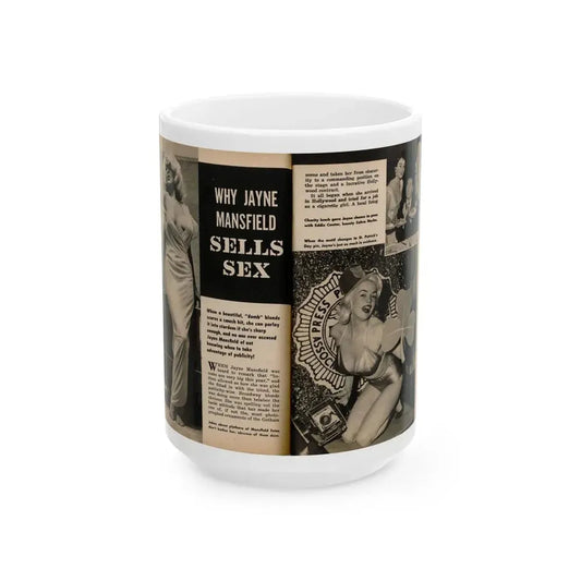 Jayne Mansfield #271 - Pages 3 & 4 of 6 with, 2 Page B&W Centerfold Photo from JEM Magazine May '57 (Vintage Female Icon) White Coffee Mug