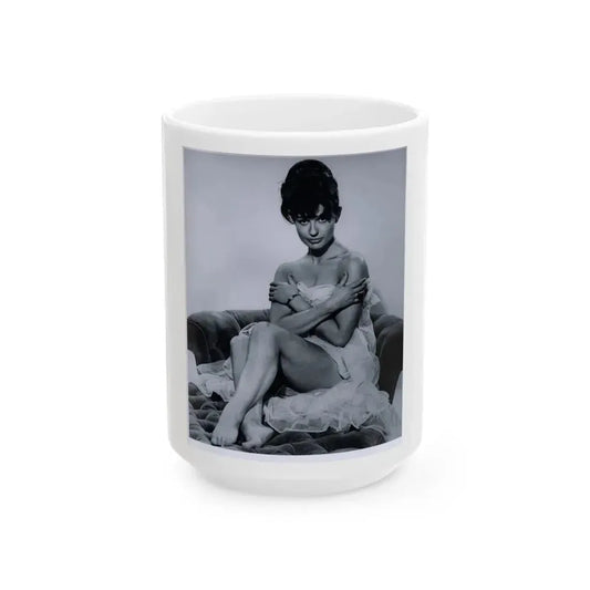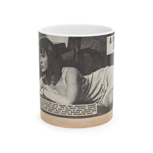 Jennifer Jayne #15 - 7x4 B&W Sexy Photo on Bed from U.K. News Paper Clipping (Vintage Female Icon) White Coffee Mug
