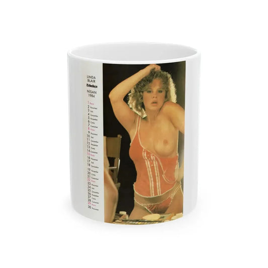 Linda Blair #341 - 6.5x9.25 Color Partially Topless Rare Erkekce Turkish Calender from 1984 (Vintage Female Icon) White Coffee Mug