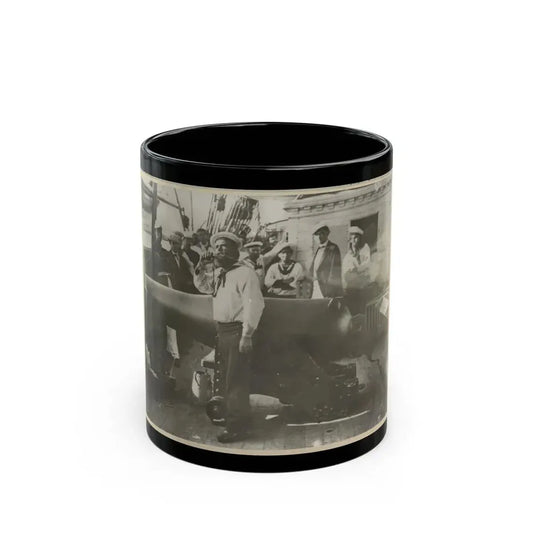 Boatswain Piping In Front Of Large Cannon On Deck Of U.S. Naval Warship; Other Sailors Standing In Background (U.S. Civil War) Black Coffee Mug