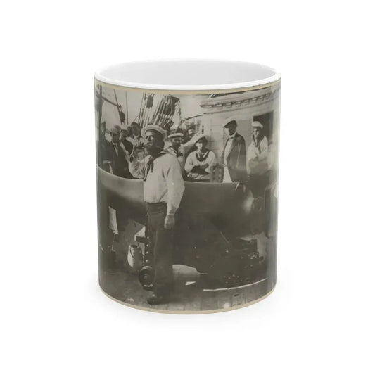 Boatswain Piping In Front Of Large Cannon On Deck Of U.S. Naval Warship; Other Sailors Standing In Background (U.S. Civil War) White Coffee Mug