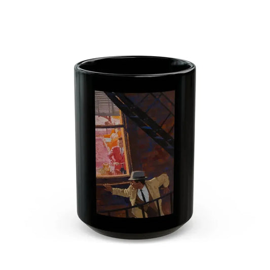 Danger on the Fire Escape - Black Coffee Mug
