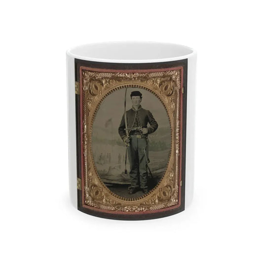 Unidentified Soldier In Union Cavalry Uniform With Sword And Pistol In Front Of Painted Backdrop Tree Stump And Military Camp (U.S. Civil War) White Coffee Mug