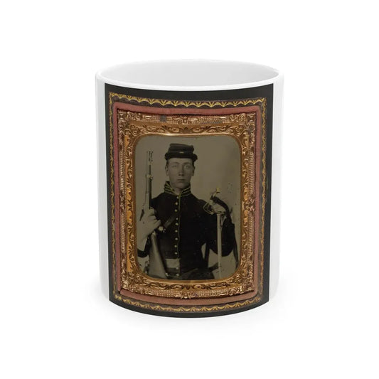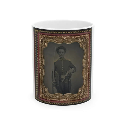 Unidentified Soldier In Union Cavalry Uniform With Percussion Cap Pistol Carbine, Attached Stock, And Cavalry Saber (U.S. Civil War) White Coffee Mug