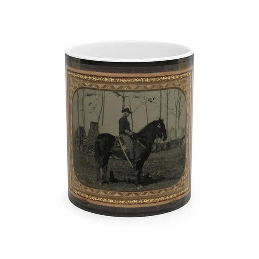 Unidentified Soldier In Union Cavalry Uniform, On Horse, With Cavalry Saber, In Front Of Encampment With Winter Chimneys (U.S. Civil War) White Coffee Mug
