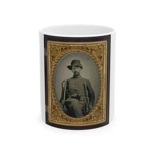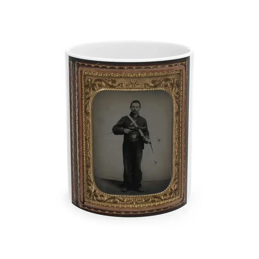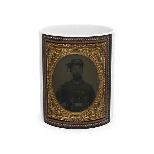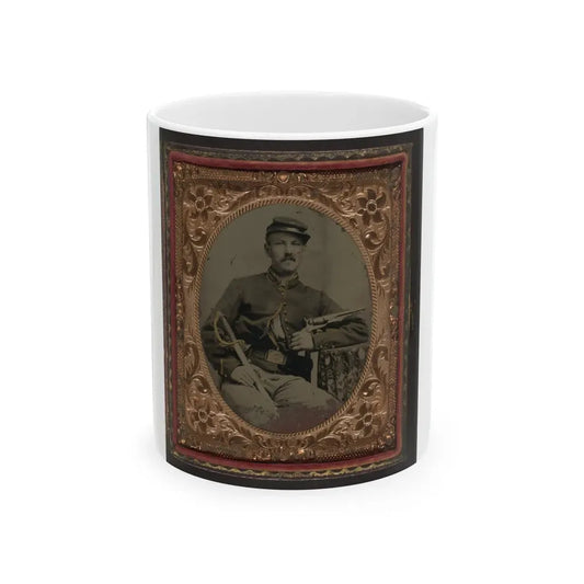 Unidentified Soldier In Union Cavalry Uniform And Hardee Hat With European Import Saber And French Lefaucheux Pinfire Revolver (U.S. Civil War) White Coffee Mug