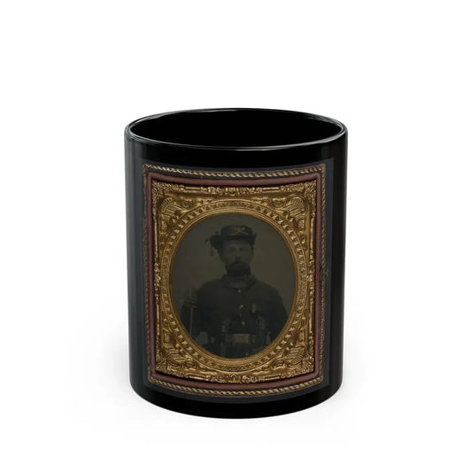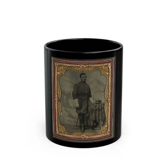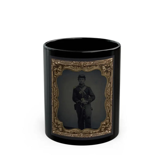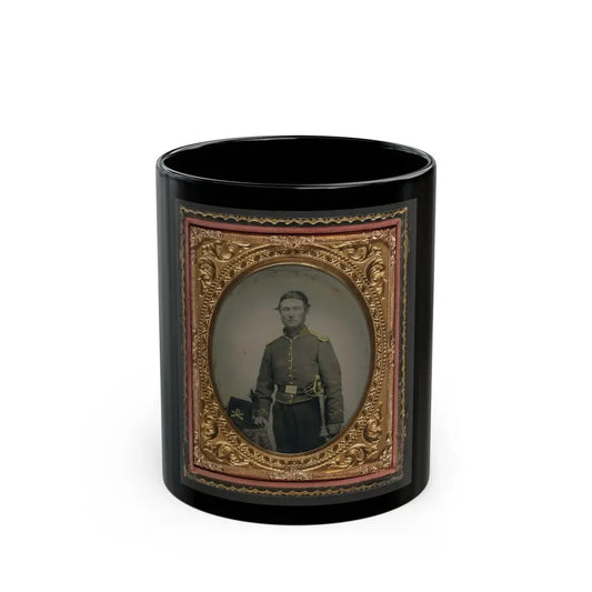 Unidentified Soldier In Union Cavalry Uniform With Cavalry Saber Next To Table With Cavalry Company D Hardee Hat (U.S. Civil War) Black Coffee Mug