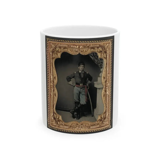 Unidentified Soldier In First Lieutenant's Uniform, Red Sash, Leather Gauntlets, And Spurs With Cavalry Sword (U.S. Civil War) White Coffee Mug