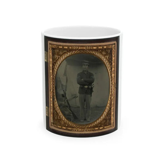 Unidentified Soldier In Infantry Sergeant Uniform With Holster And Musket In Front Of Tent (U.S. Civil War) White Coffee Mug