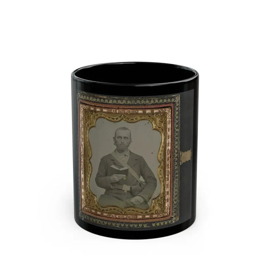 Unidentified Soldier In Confederate Uniform And C.S.A. Belt Buckle With Cartridge Box And Percussion Cap Box, Holding A Book (U.S. Civil War) Black Coffee Mug