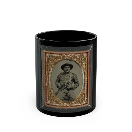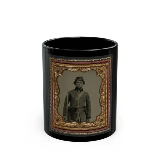 Unidentified Soldier In Confederate Frock Coat And Forage Cap With Cap Box, Bayoneted Musket, And Holstered Revolver (U.S. Civil War) Black Coffee Mug