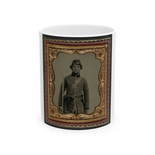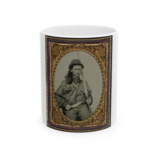 Unidentified Soldier In Confederate Frock Coat And Forage Cap With Cap Box, Bayoneted Musket, And Holstered Revolver (U.S. Civil War) White Coffee Mug