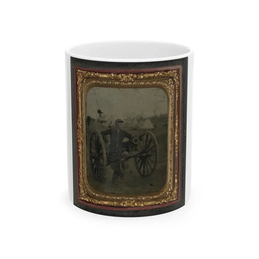 Unidentified Soldier In Union Uniform Standing With Napoleon Cannon In Front Of Encampment (U.S. Civil War) White Coffee Mug