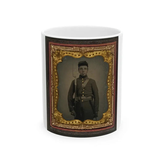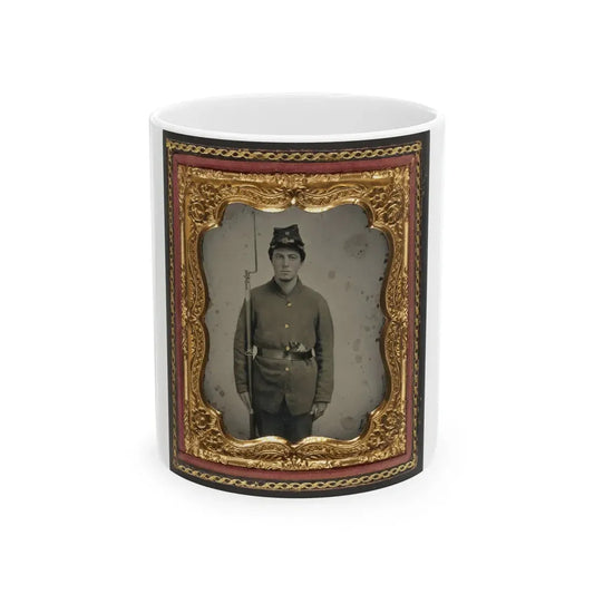 Unidentified Soldier In Union Uniform And Forage Cap With Holstered Revolver And Bayoneted Musket (U.S. Civil War) White Coffee Mug