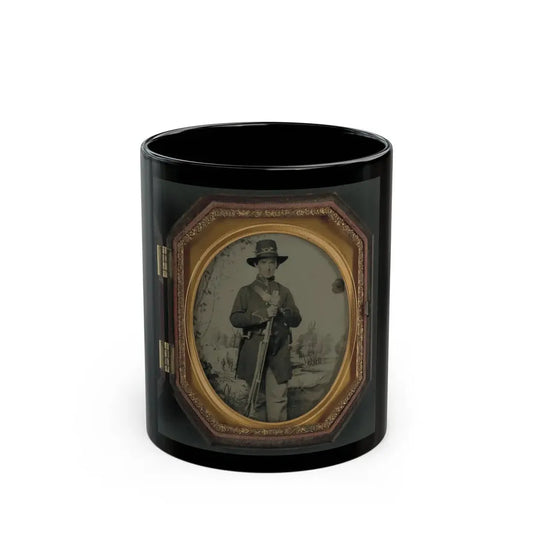 Unidentified Soldier In Union Uniform And Hardee Hat With Rifle In Front Of Painted Backdrop Showing Military Camp (U.S. Civil War) Black Coffee Mug