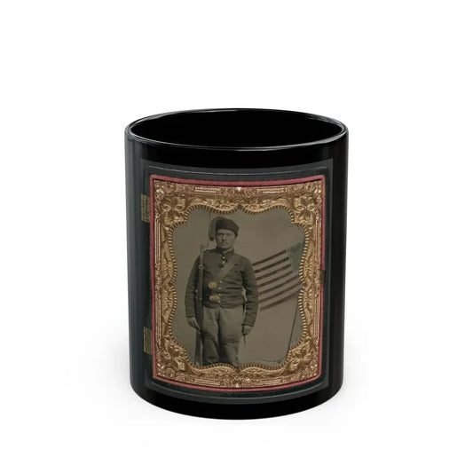 Unidentified Soldier In Union Uniform And Fez With Bayoneted Musket In Front Of Painted Backdrop Showing American Flag (U.S. Civil War) Black Coffee Mug