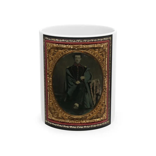 Private William P. Haberlin Of Battery B, Pennsylvania Light Artillery In Uniform With Shoulder Scales And Great Coat (U.S. Civil War) White Coffee Mug
