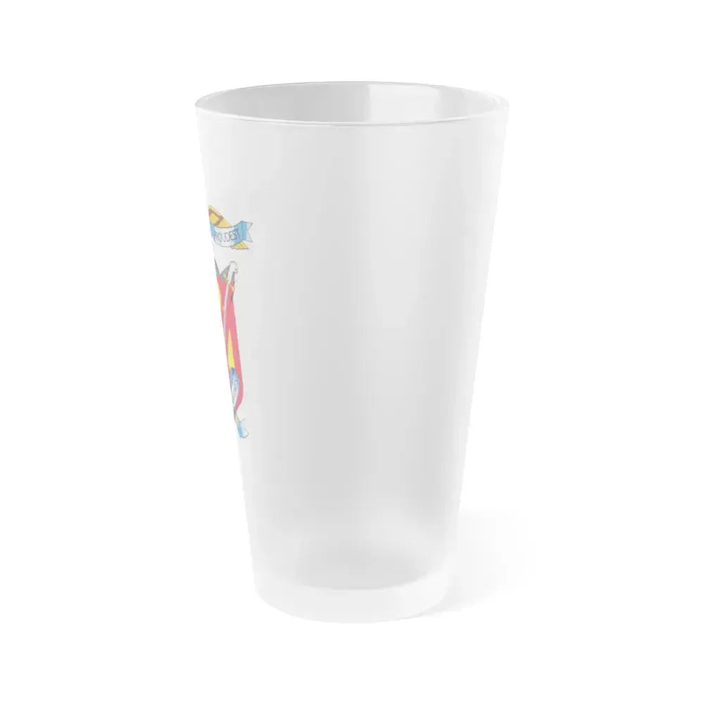 Frosted pint glass (16 oz / ≈0.47 L) with a soft matte finish and semi-translucent, one-sided print. Tough enough for bar and restaurant use, dishwasher safe, and BPA-free — a modern take on classic pintware.