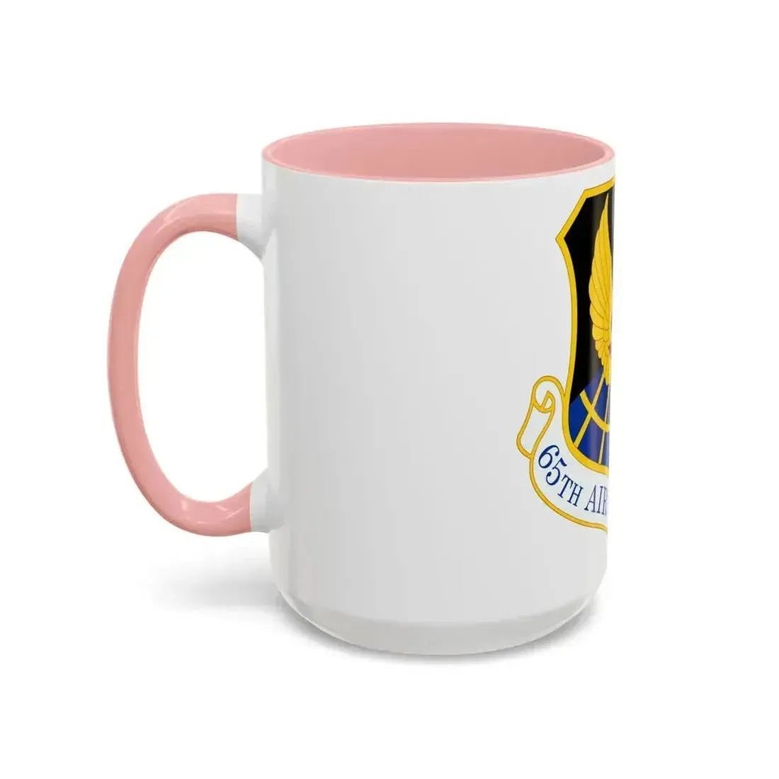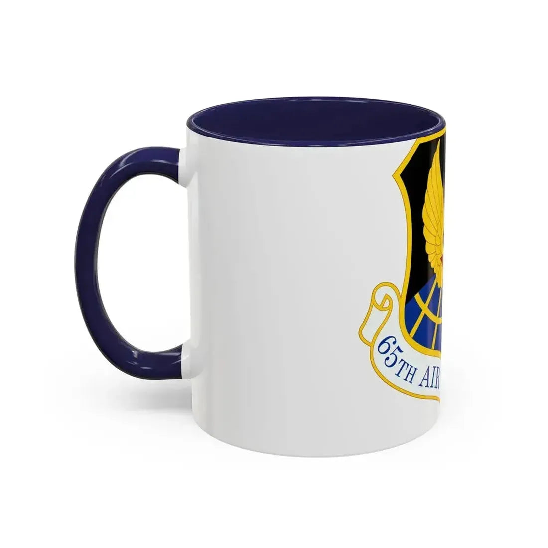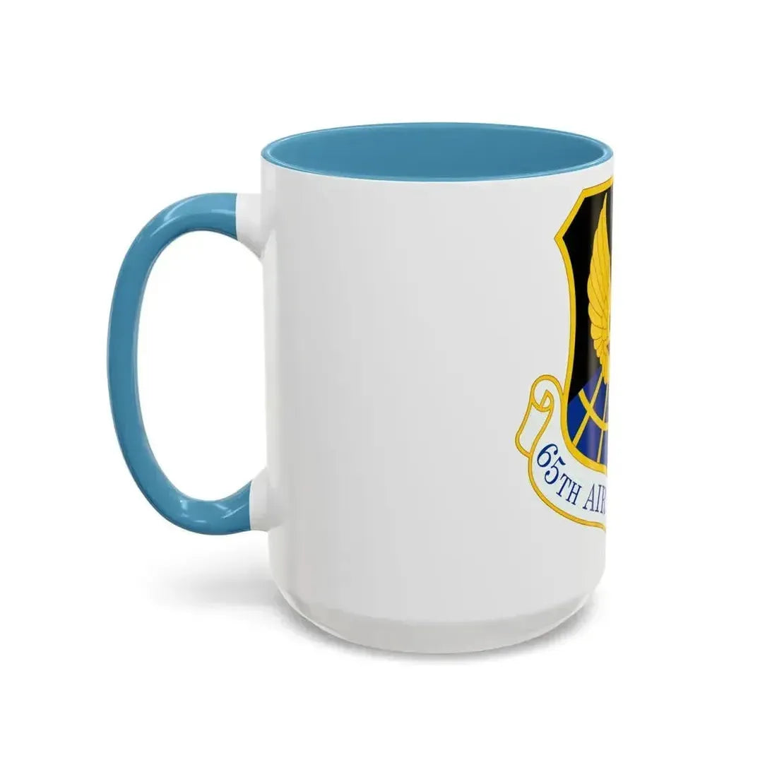Celebrate your love for the U.S. Air Force with this 65 Air Base Group USAFE Accent Coffee Mug. This mug showcases an impressive design inspired by the iconic logo of the 65th Air Base Group, part of the United States Air Forces in Europe (USAFE). The artwork on the mug captures the spirit and pride associated with this esteemed group. The design features a stylized emblem, complete with a distinctive airplane silhouette and the numerals "65" prominently displayed.