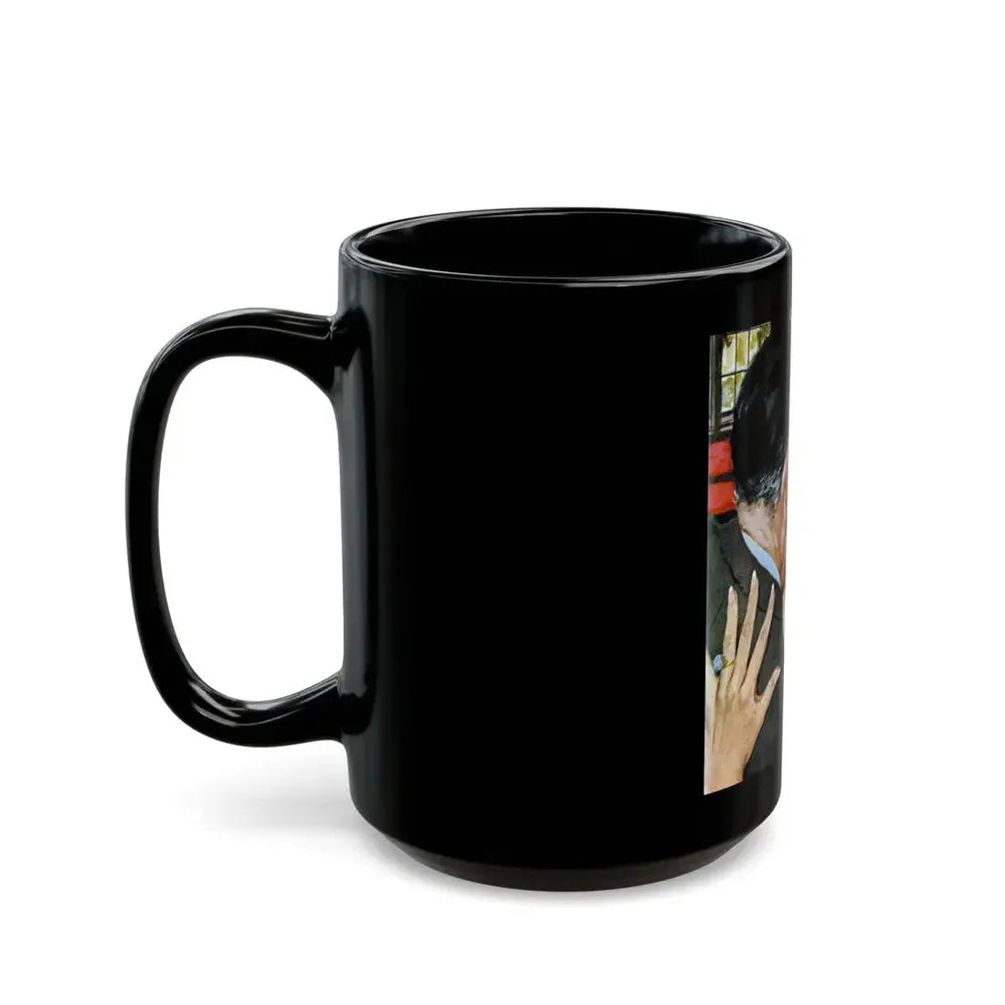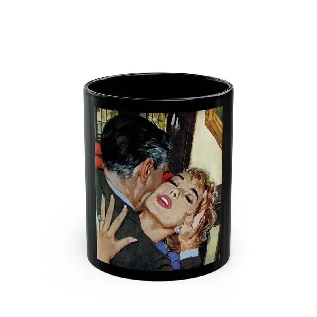 This black mug's got a pretty wild design. It's got this painting of a guy kissing a girl right on the front. Don't know who they are or what's going on, but it's definitely got a vintage feel to it. Would look pretty cool on your coffee table or something.