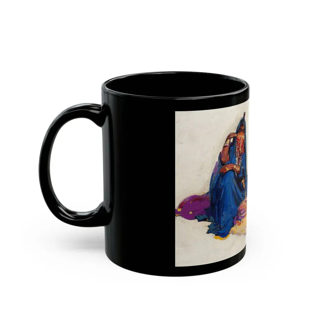 This mug's got a really cool vibe, you know? It's got this woman sitting on the ground in black and white, looking all serene. I guess it's inspired by that whole pilgrimage thing to Palestine in '27. It's got that vintage, artistic feel going on. Super pretty!