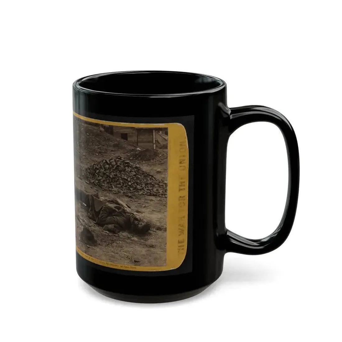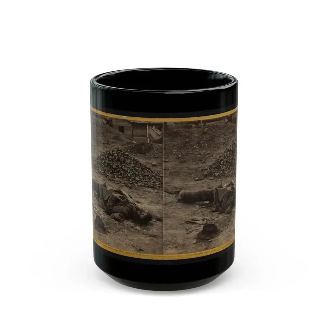 This coffee mug showcases an intriguing design inspired by the American Civil War, focusing on a rebel soldier before the Battle of Petersburg. The artwork captures a poignant moment in history, with the fallen soldier serving as a reminder of the sacrifice made during this significant conflict. History enthusiasts and individuals interested in military history would find this mug particularly appealing, as it offers a unique way to pay tribute to the past.
