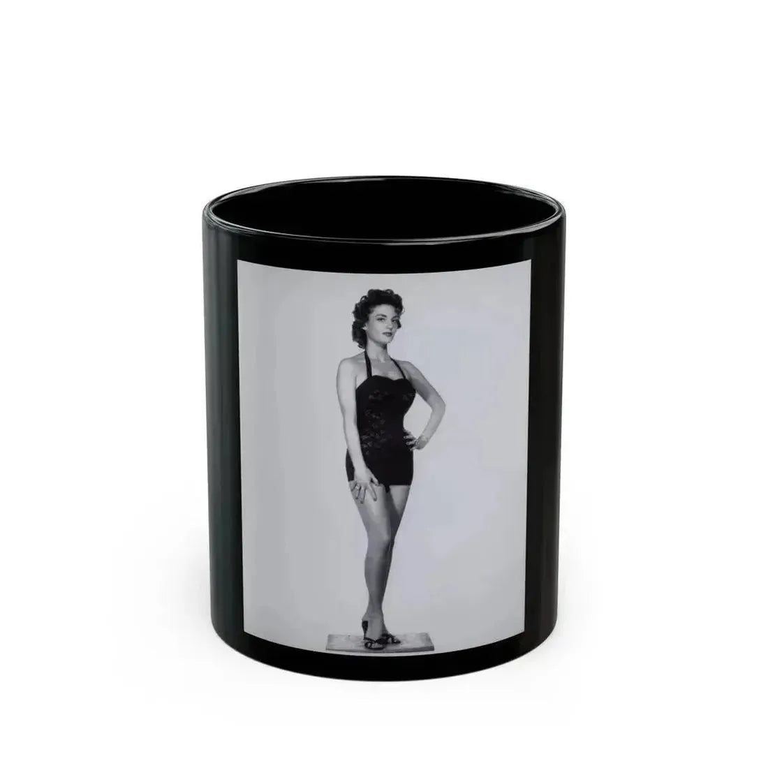 This black coffee mug showcases an iconic image from the vintage era, featuring Allison Hayes in a one-piece swimsuit. Known for her roles in science fiction and horror films during the 1950s and 60s, Hayes also gained recognition as a pin-up model. The design on this mug captures the classic cheesecake style of the era, with the 8x10 B&W photo reproduction beautifully showcasing the timeless appeal of Hayes' image. This mug is perfect for anyone who appreciates unique and cool drinkware, as well as those with an interest in vintage female icons or classic pin-up art.