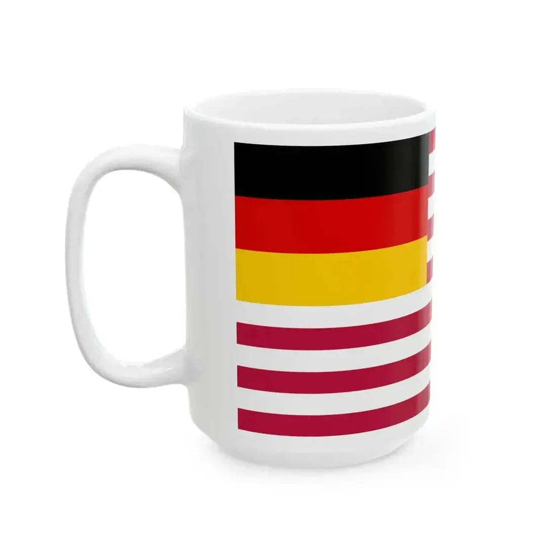Celebrate your love for two great nations with this American-German flag coffee mug. This unique design cleverly combines the iconic symbols of both countries, making it a perfect conversation starter at breakfast or during your daily coffee breaks. The artful arrangement showcases the stars and stripes of the American flag side by side with the colors and coat of arms of Germany. Whether you're an expat who misses home, a dual citizen looking to show your pride, or simply a history buff captivated by these two powerful nations, this mug will be a cherished addition to your collection.