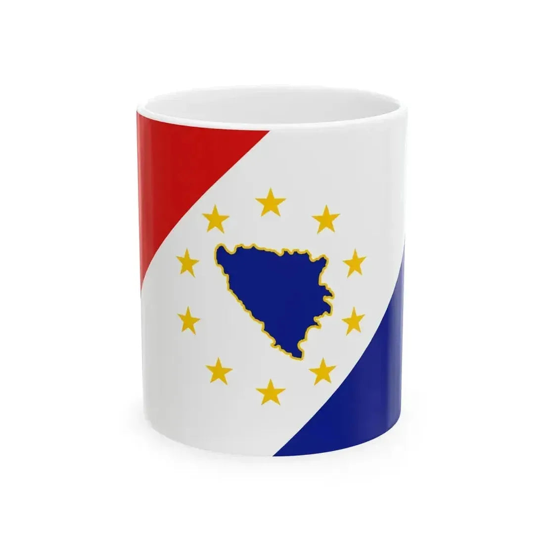 This "BH First Alternative Flag of Second Proposal (Bosnia and Herzegovina)" White Coffee Mug showcases a unique design that captures an alternative vision for the national flag of Bosnia and Herzegovina. The design, based on the second proposal from 1992, features a horizontal tricolor of yellow, blue, and red with a circular emblem in the center. This artwork serves as a thought-provoking conversation starter for anyone with an interest in the history, politics, or culture of Bosnia and Herzegovina. Perfect for anyone who appreciates unique and cool drinkware.