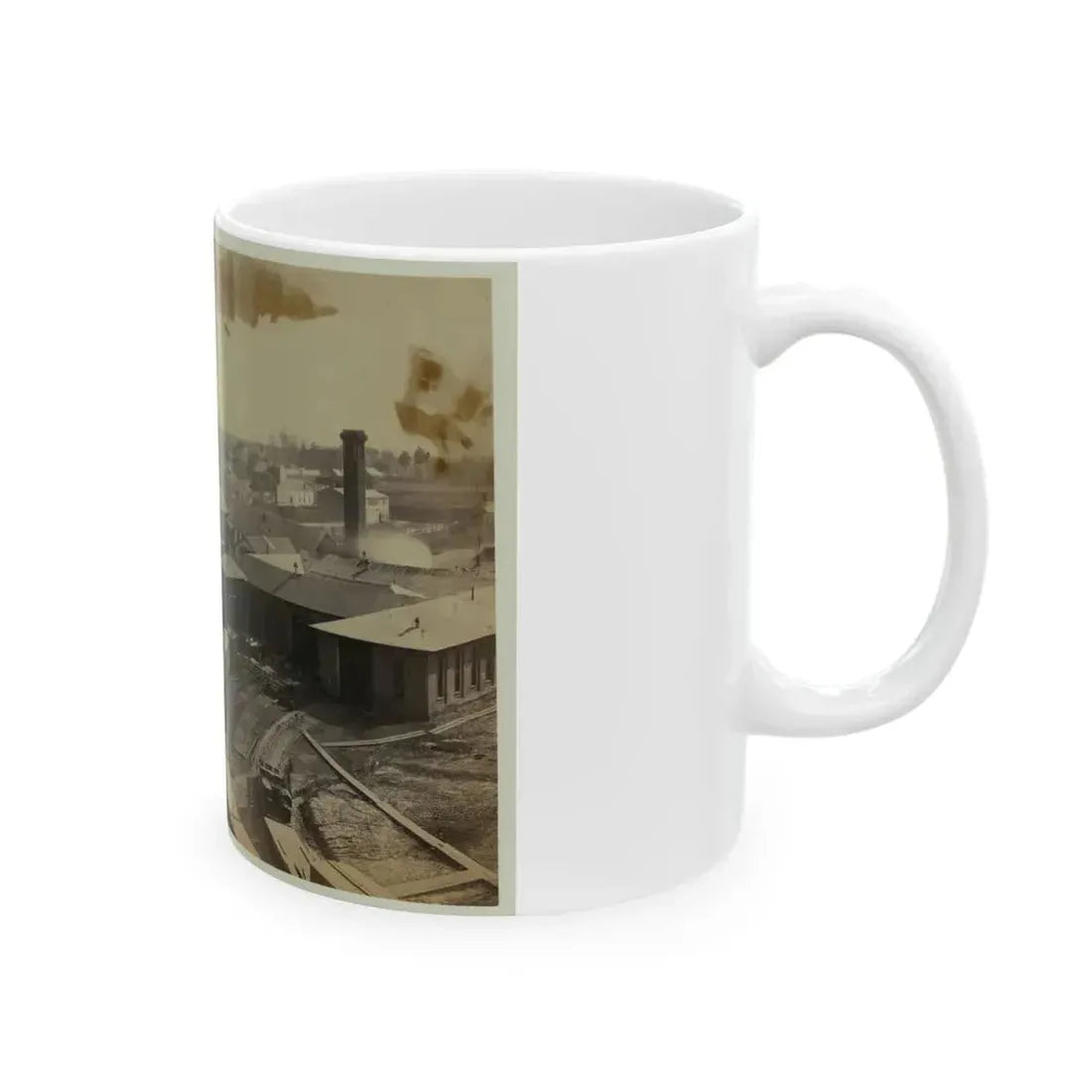 This unique coffee mug showcases an artistic interpretation of a bird's eye view of machine shops during the U.S. Civil War era, specifically focusing on the East Yard of the Orange & Alexandria Railroad. The intricate design captures the bustling activity of the time, with various machinery and railroad cars scattered across the yard. History enthusiasts and those with an appreciation for industrial-era artifacts will find this mug a fascinating addition to their collection.