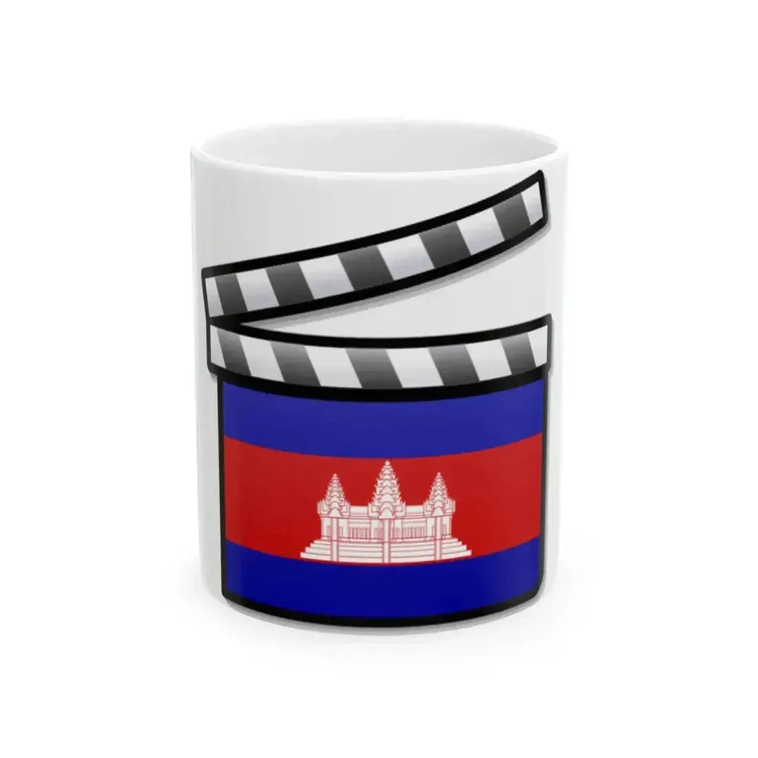 The Cambodia film clapperboard design on this white coffee mug pays homage to the rich cinematic history of Cambodia, a Southeast Asian nation known for its diverse culture and artistic traditions. This unique piece of drinkware showcases an authentic representation of a film clapperboard, symbolizing the start and stop of scenes in a movie production. The design subtly incorporates iconic Khmer architectural elements, tying the artwork to Cambodia's heritage and identity.