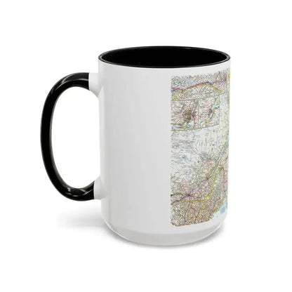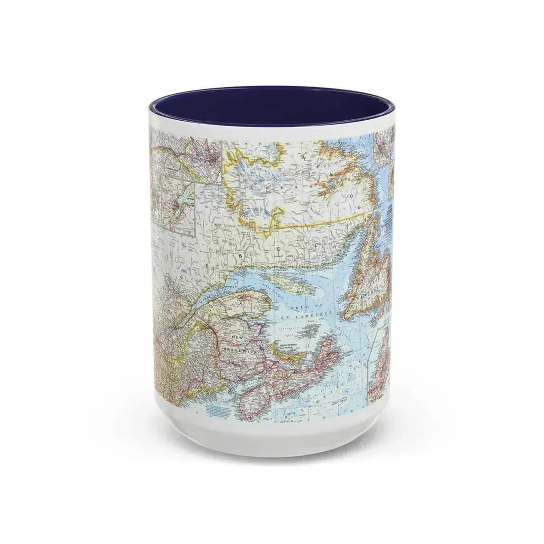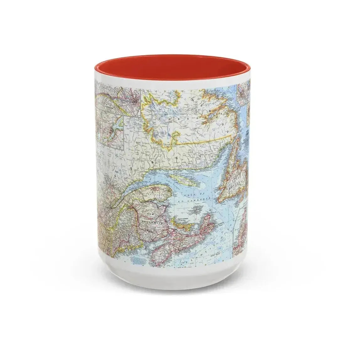 The "Canada - Eastern (1967) Map" Accent Coffee Mug showcases a distinct representation of the eastern part of Canada as it appeared in 1967. This region includes provinces such as Quebec, Newfoundland and Labrador, Nova Scotia, Prince Edward Island, New Brunswick, Ontario, and the territories of Nunavut and Northwest Territories. The design, inspired by a map from that era, offers a unique blend of history and geography, making it an excellent choice for anyone with an interest in Canada's past or Canadian studies.