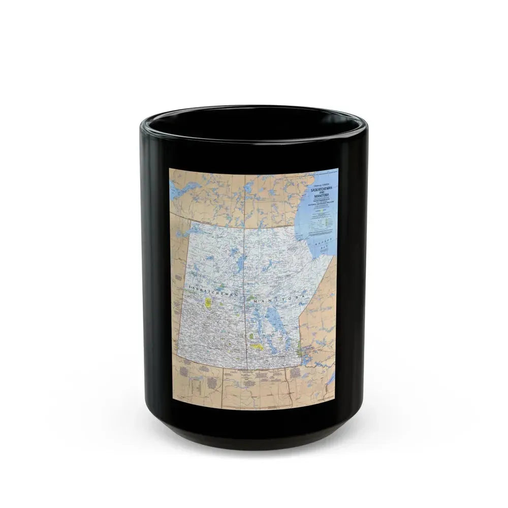 The intricate details in this design include the provincial boundaries, cities, towns, rivers, and lakes of Saskatchewan and Manitoba. The black finish gives a modern twist to the classic map aesthetic, making it both functional and visually appealing. This mug is an excellent gift idea for Canadians, history buffs, or anyone who enjoys a touch of geography in their daily routine.