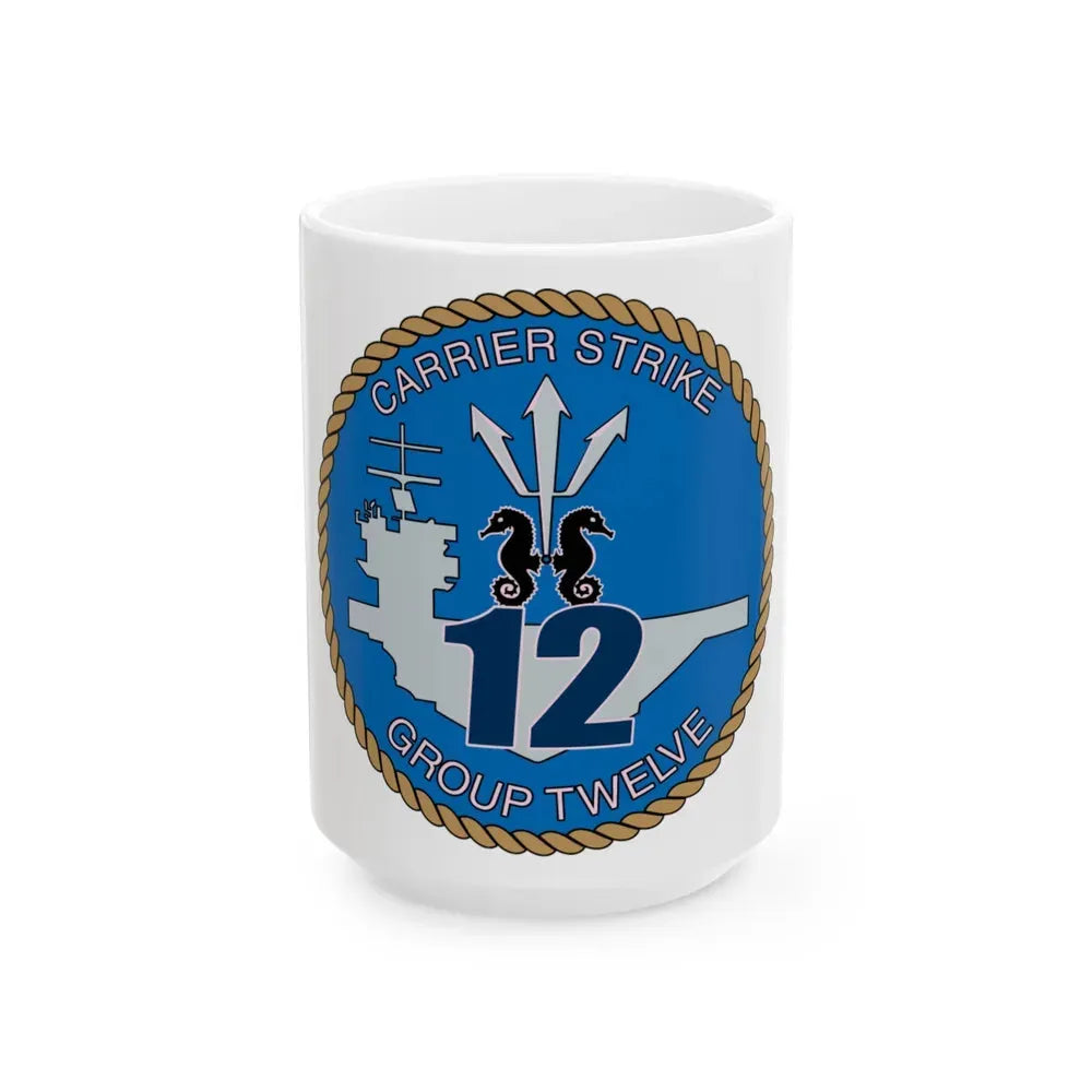 Celebrate your admiration for the U.S. Navy's Carrier Strike Group 12 (CSG 12) with this distinctive coffee mug. The white ceramic mug showcases a bold design that replicates the emblem of CSG 12, making it an ideal choice for naval enthusiasts and history buffs. This unique piece of drinkware features intricate artwork reminiscent of the U.S. Navy's strength and precision, adding a touch of nautical flair to your morning routine.