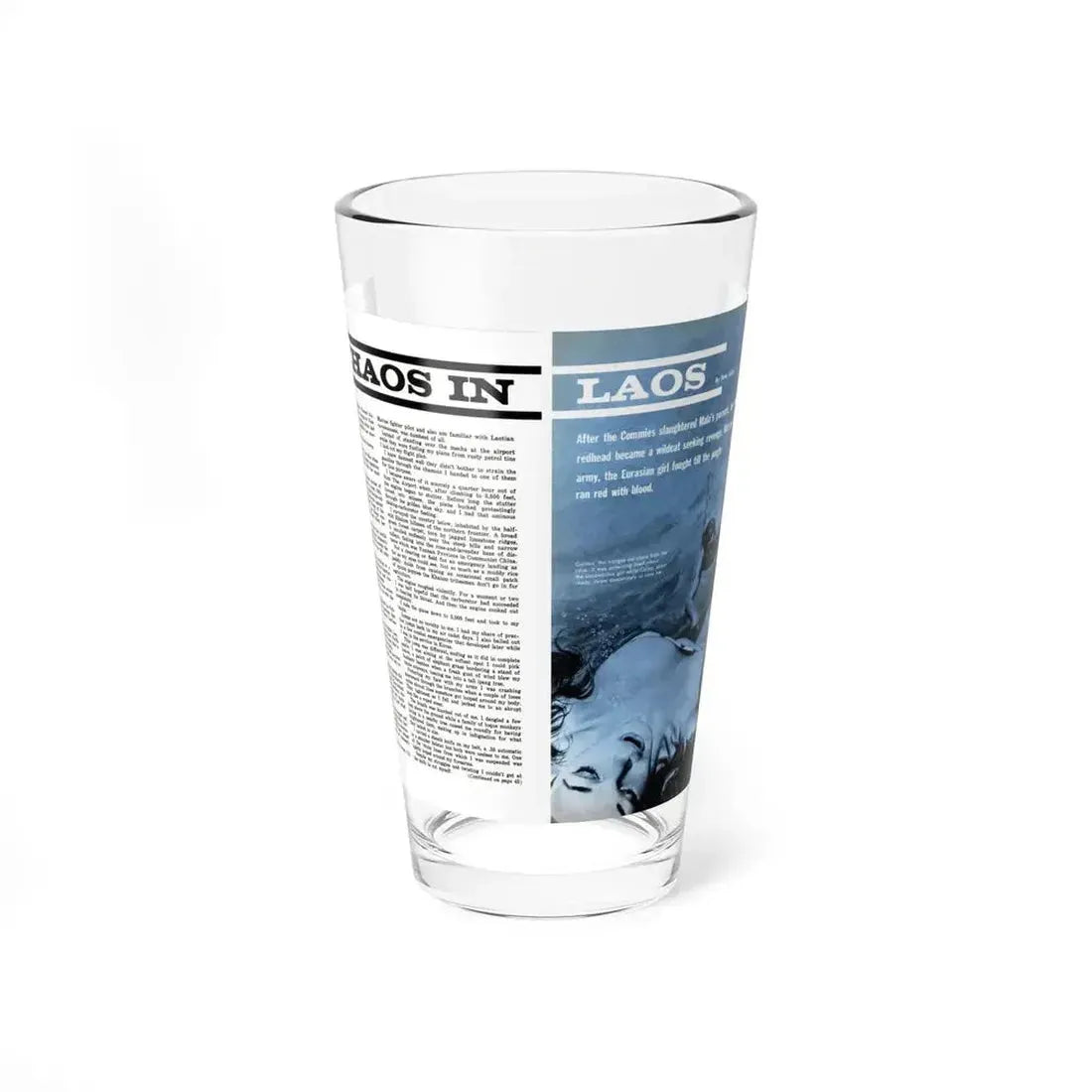 Delve into the enigmatic charm of Laos in the 1960s with every sip from this Chaos In Laos, Bluebook for Men, 1962 Pint Glass. This unique drinkware piece is inspired by a magazine illustration that captures the essence of adventure and intrigue from a bygone era. The design, a timeless tribute to the Southeast Asian country's vibrant culture and history, promises to transport you to the bustling streets of Vientiane or the tranquil Mekong River banks with each glance. Perfect for anyone who appreciates unique and cool drinkware, this glass is a testament to the enduring allure of storytelling through art.