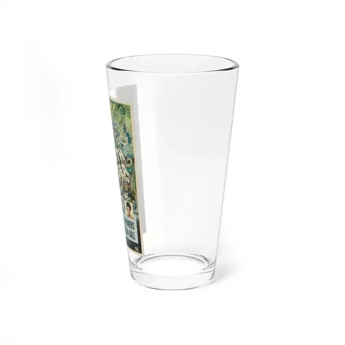 Step into an underwater metropolis inspired by the classic 1953 film "City Beneath the Sea" with this exquisite pint glass. This unique drinkware features captivating artwork depicting a submerged cityscape, complete with towering structures and vibrant marine life. The design beautifully embodies the spirit of the original movie, where a world underwater becomes home to both humans and sea creatures. Perfect for anyone who appreciates unique and cool drinkware.
