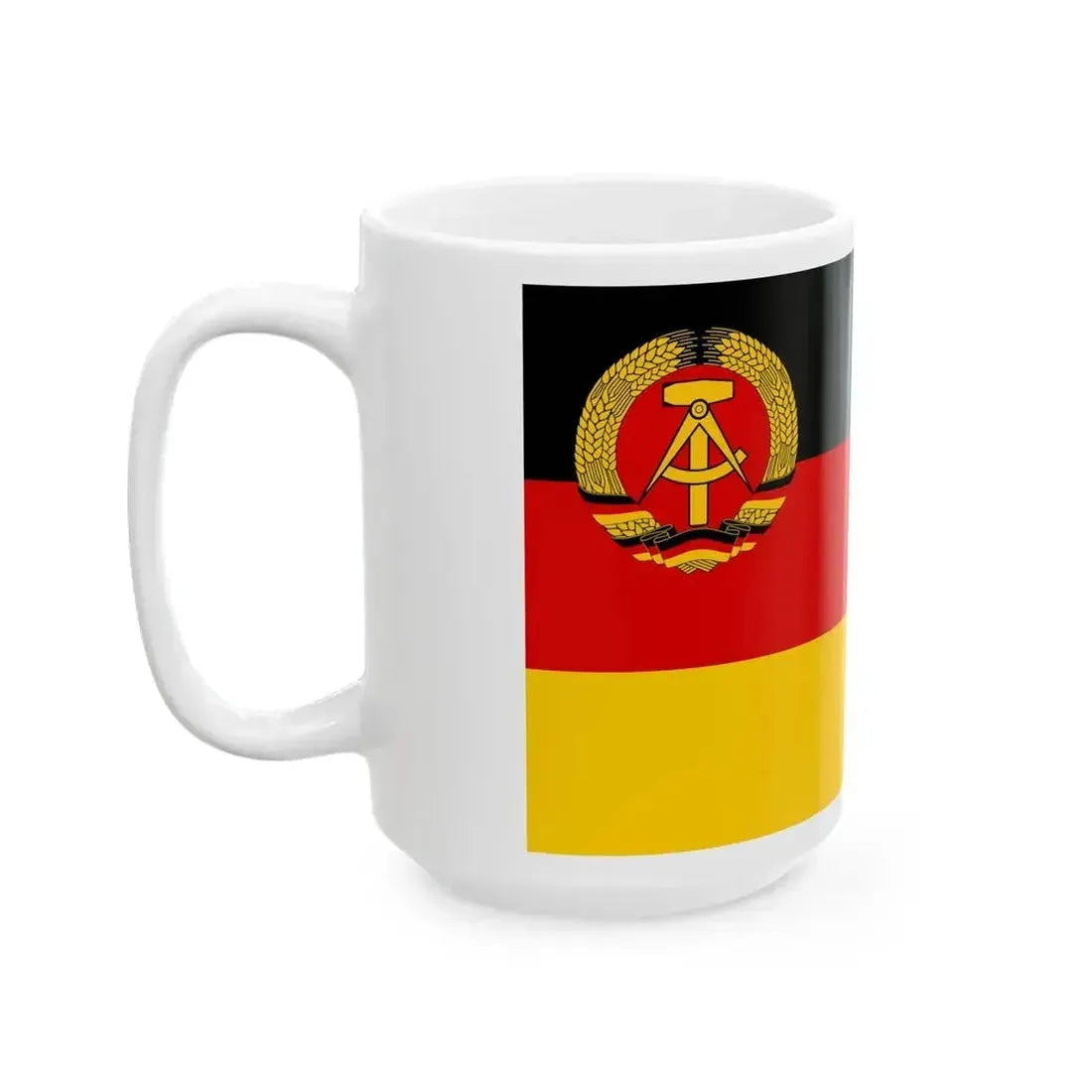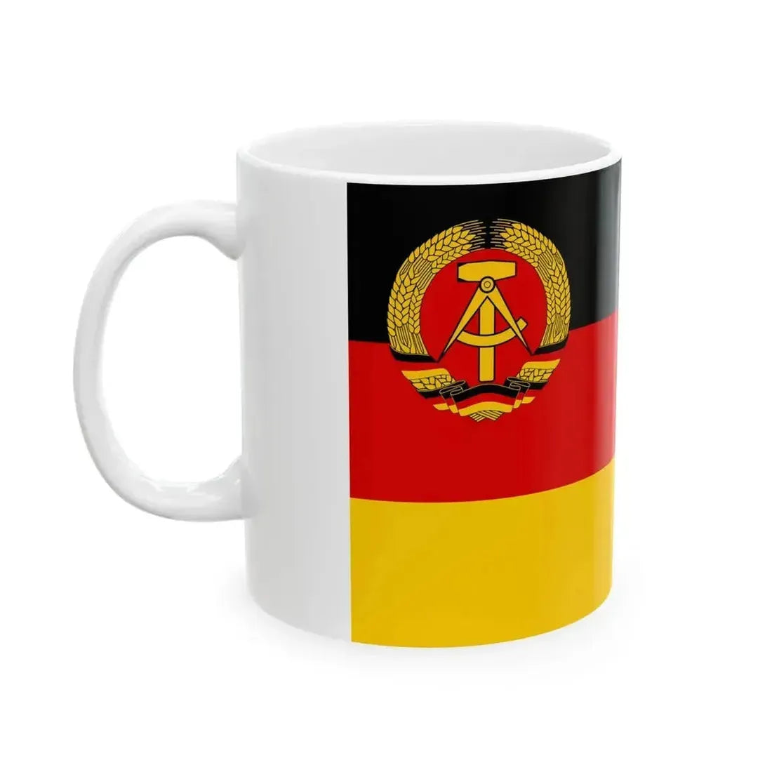 This coffee mug showcases the Civil Ensign of East Germany, offering a unique and educational drinking vessel for history enthusiasts. The design accurately represents the flag's distinctive red field and emblem, providing an opportunity to display and discuss this important symbol of the GDR era. Perfect for anyone who appreciates unique and cool drinkware, particularly those with an interest in Cold War history or East German culture.