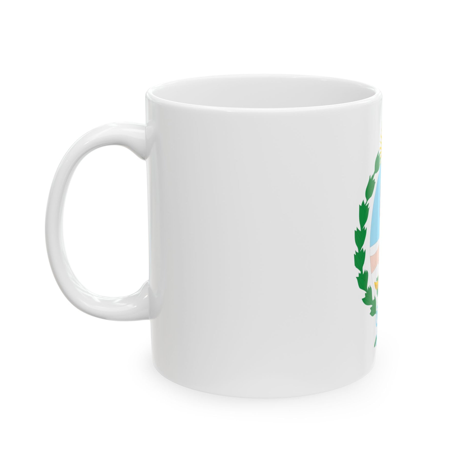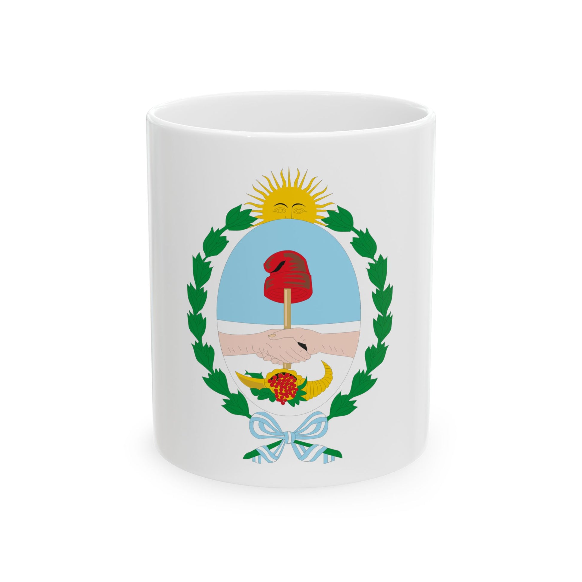The Coat of Arms Mendoza Argentina - White Coffee Mug showcases a symbolic representation of the province of Mendoza, Argentina. This region is renowned for its vineyards and mountainous landscapes, making it an appealing choice for wine enthusiasts and lovers of South American culture. The design on the mug features the official coat of arms of Mendoza, which includes a grape cluster surrounded by mountains to represent the province's agricultural and geographical characteristics.