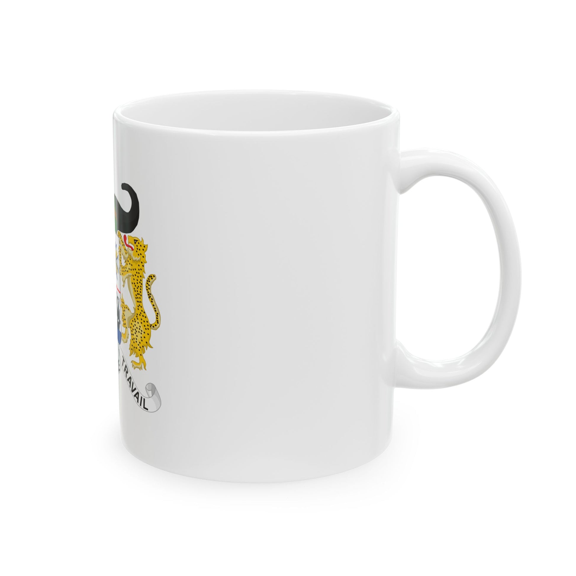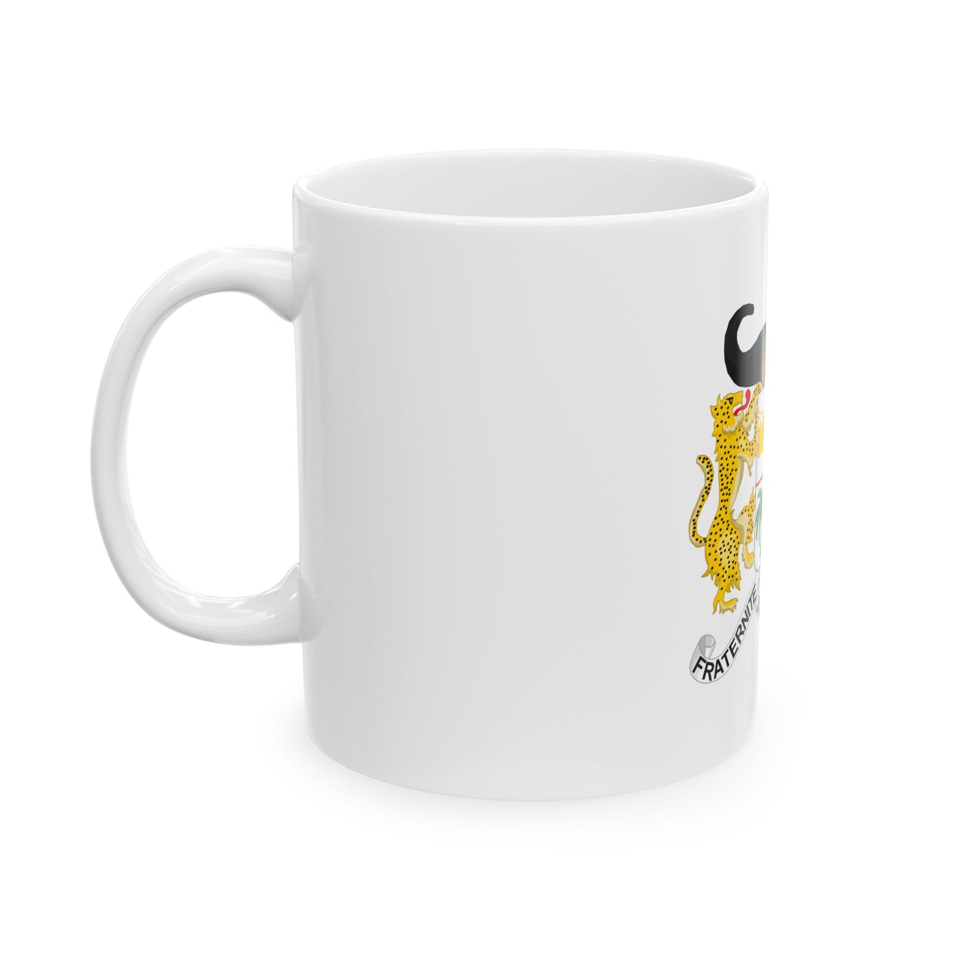 This striking coffee mug showcases the official Coat of Arms of the Republic of Benin, a powerful symbol of the nation's identity and values. The design centers on a meticulously rendered shield, meticulously divided into quadrants, each brimming with symbolic imagery.