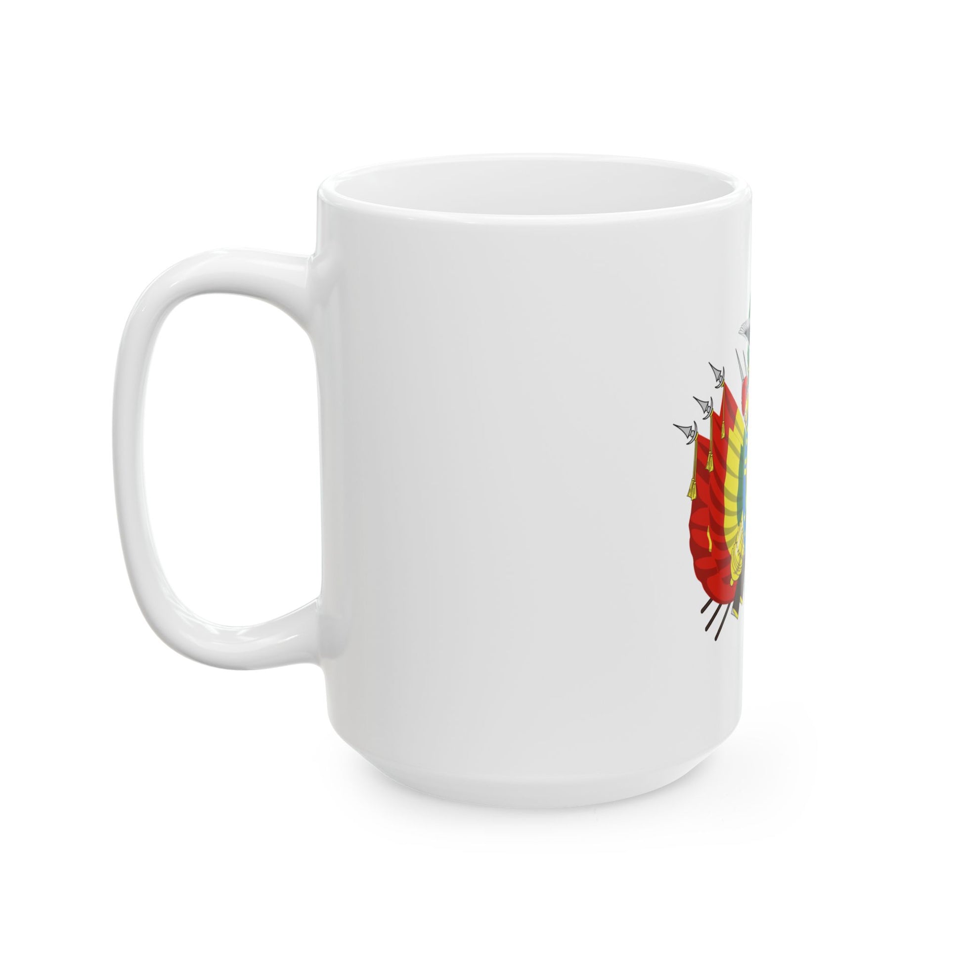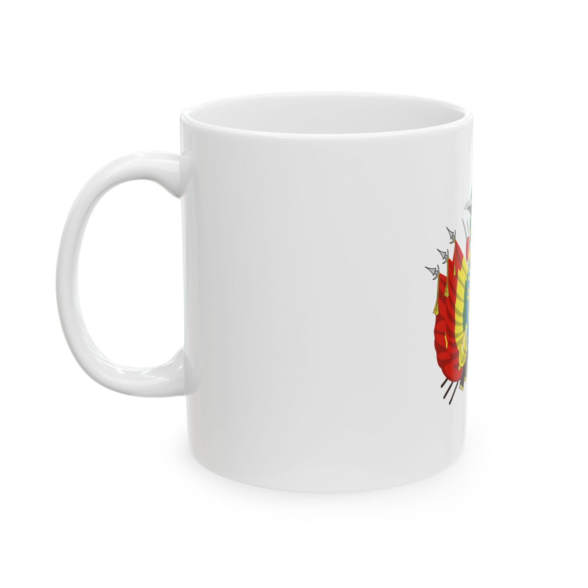 Embodying the proud heritage of Bolivia, this White Coffee Mug showcases an iconic design - the Coat of Arms of Bolivia. The artwork on the mug features a shield with three vertical bands representing the three geographical regions of the country: the Andes Mountains, the Yungas (tropical rainforest), and the Altiplano (high plateau). The central image is the condor, a revered bird in Bolivian culture, symbolizing freedom and power. The mug's design also includes the national flower, the cactus, and the national tree, the Polylepis. Perfect for anyone who appreciates unique and cool drinkware, this mug makes an excellent choice for anyone with a soft spot for South American cultures or those interested in global symbols and heraldry.