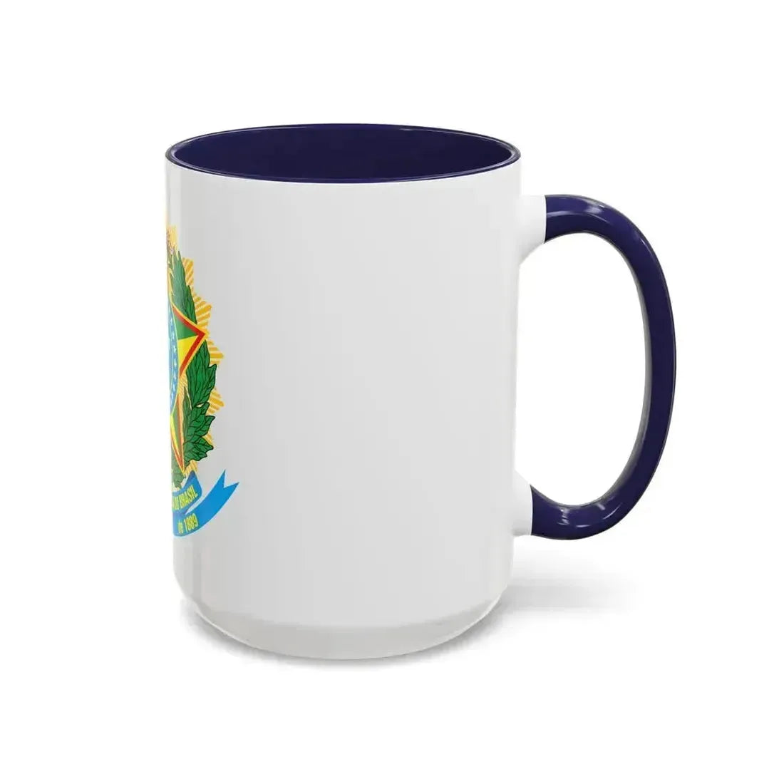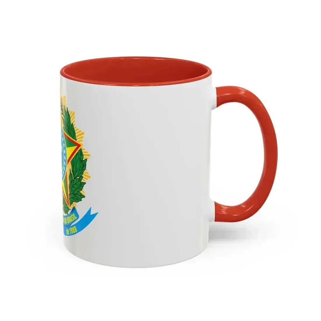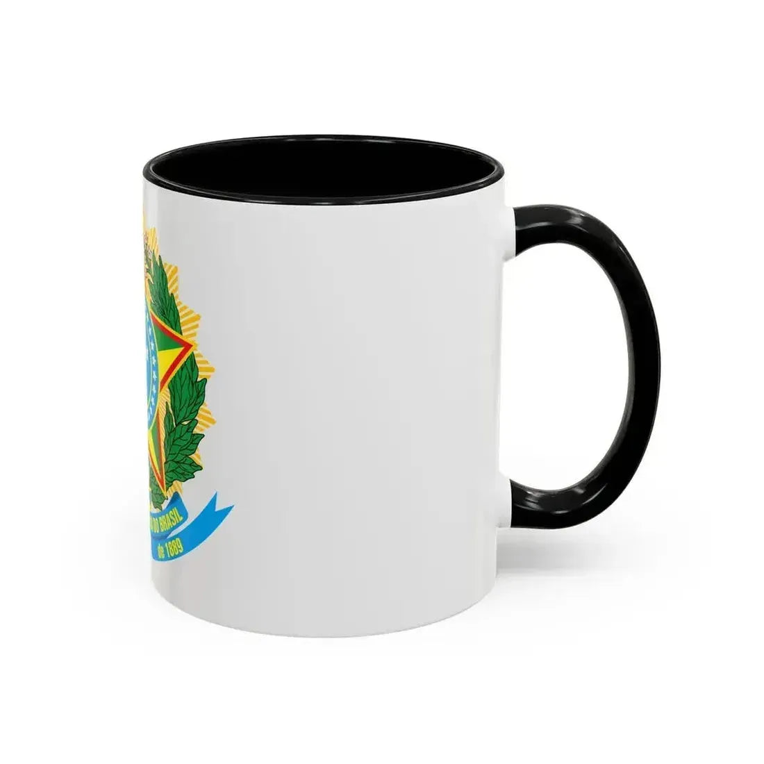 This Accent Coffee Mug showcases the Coat of Arms of Brazil, a symbol deeply rooted in the country's rich history and culture. The design features a shield divided into quadrants, each representing one of the five states that founded Brazil: Para, Rio de Janeiro, Minas Gerais, São Paulo, and Espírito Santo. The shield is crowned by a imperial mantle, symbolizing the monarchy that ruled the country from 1822 to 1988. The mug makes an excellent gift for anyone with a fascination for Brazil's heritage, or for those who appreciate unique and thoughtful drinkware.