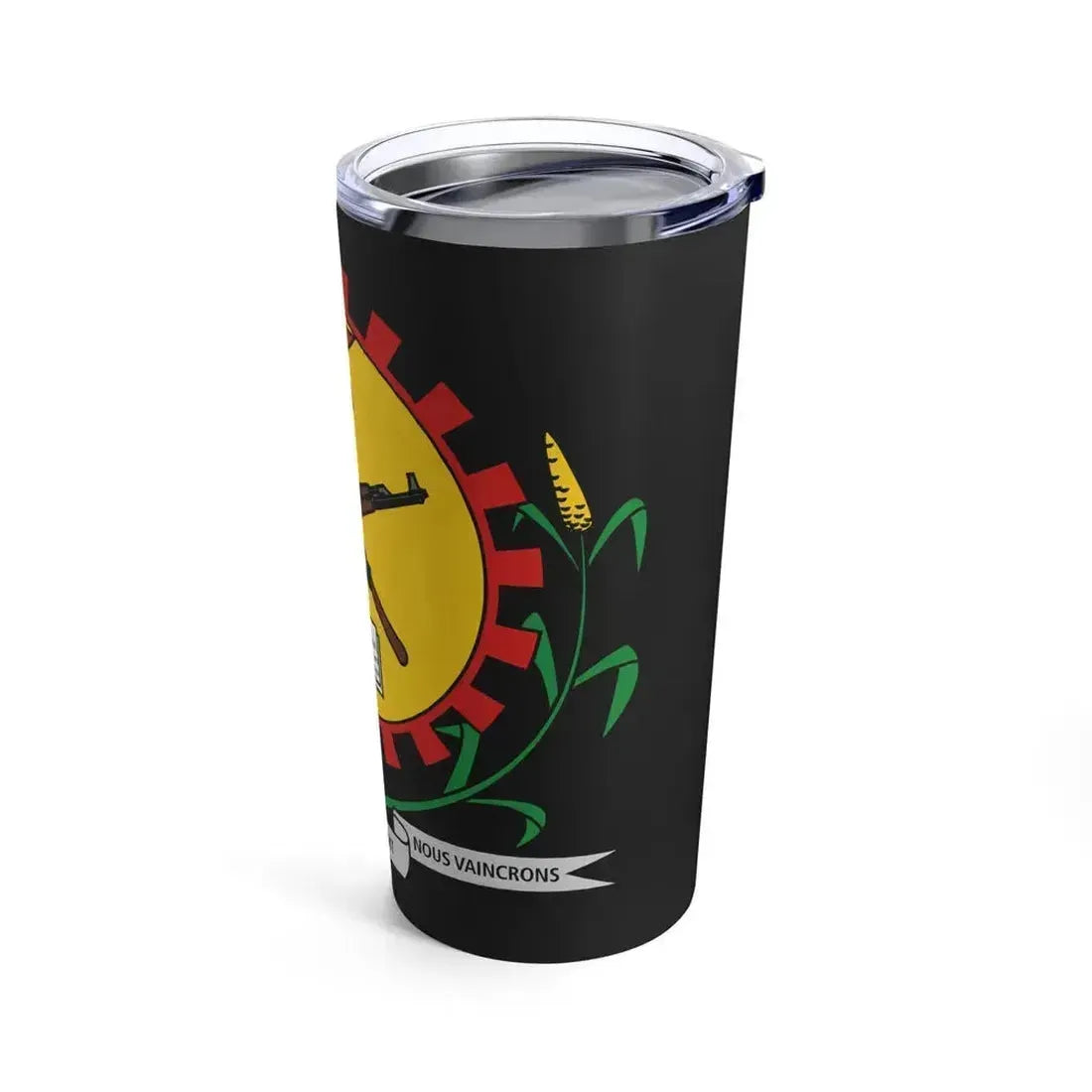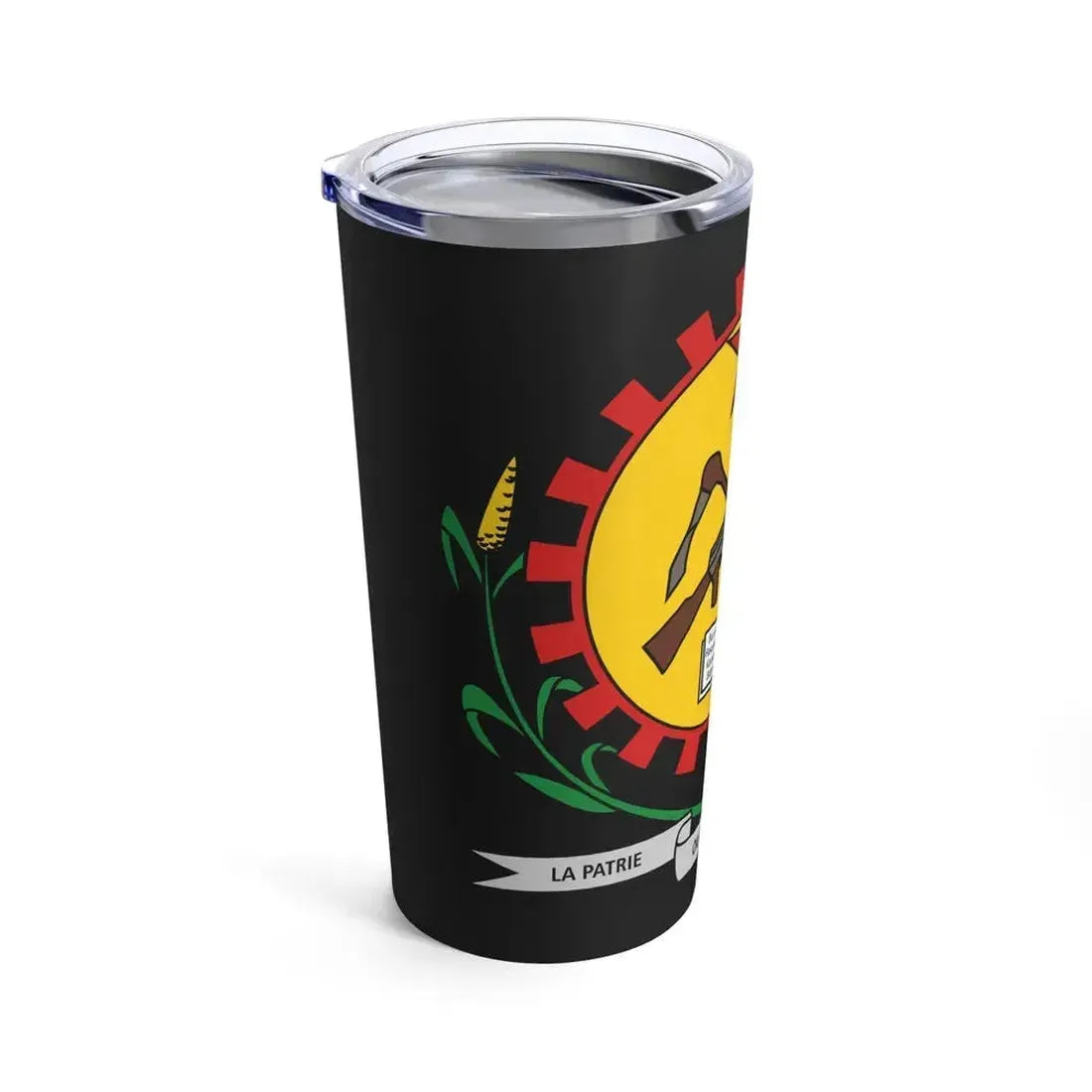 This 20oz tumbler showcases the Coat of Arms of Burkina Faso as it was designed in 1984 and used until 1991. The emblem represents the country's rich history and cultural heritage. The shield is divided into three sections, with a sheaf of corn on the left, a banana tree in the center, and a cotton boll on the right, symbolizing Burkina Faso's agricultural importance. A bald eagle, the national bird, is depicted at the top, holding a sheaf of arrows, signifying the nation's readiness for defense. The motto "Unité, Travail, Progrès" (Unity, Work, Progress) is written across the base in French. This tumbler is perfect for anyone who appreciates unique and cool drinkware with a touch of world history.
