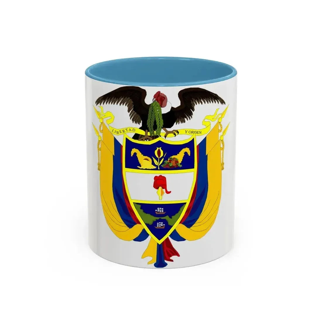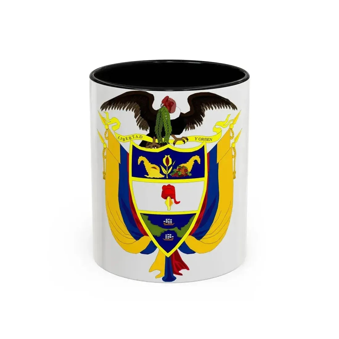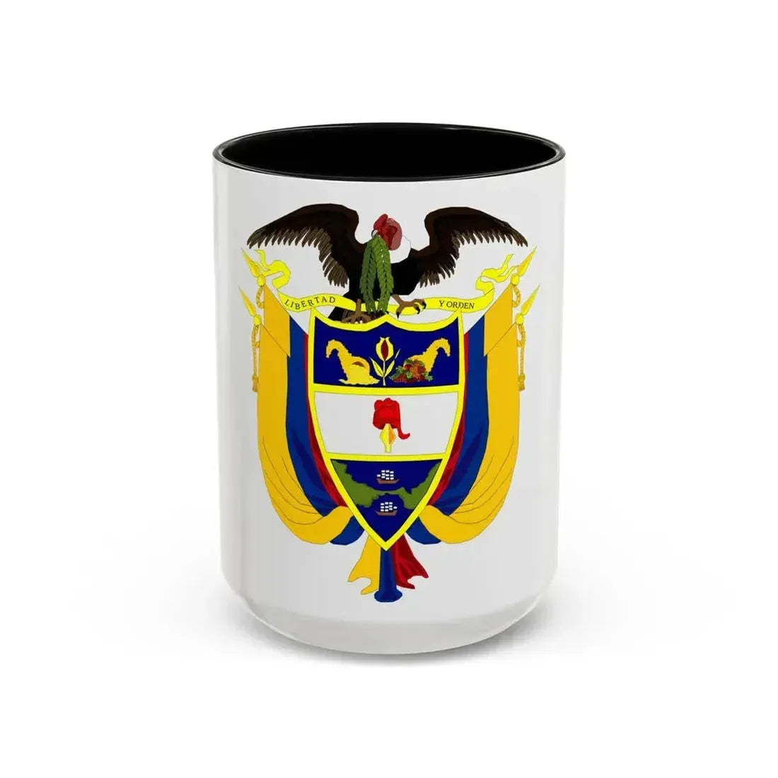 Step into a vibrant and symbolic journey with this Coat of Arms of Colombia 4 Accent Coffee Mug. This intriguing piece showcases the rich heritage of Colombia through its emblematic coat of arms, a visual representation that encapsulates the country's spirit and pride. The design includes the bold shield, adorned with the national bird, the Andean condor, symbolizing freedom and power. The vertical stripes represent the three geographical regions - mountains, plains, and seas - of Colombia. This mug is perfect for anyone who appreciates unique and cool drinkware, as well as for individuals with a special connection to Colombia or those fascinated by its history and culture. Whether sipping your morning coffee or enjoying an evening beverage, this captivating mug will add a touch of exotic charm to your daily routine.