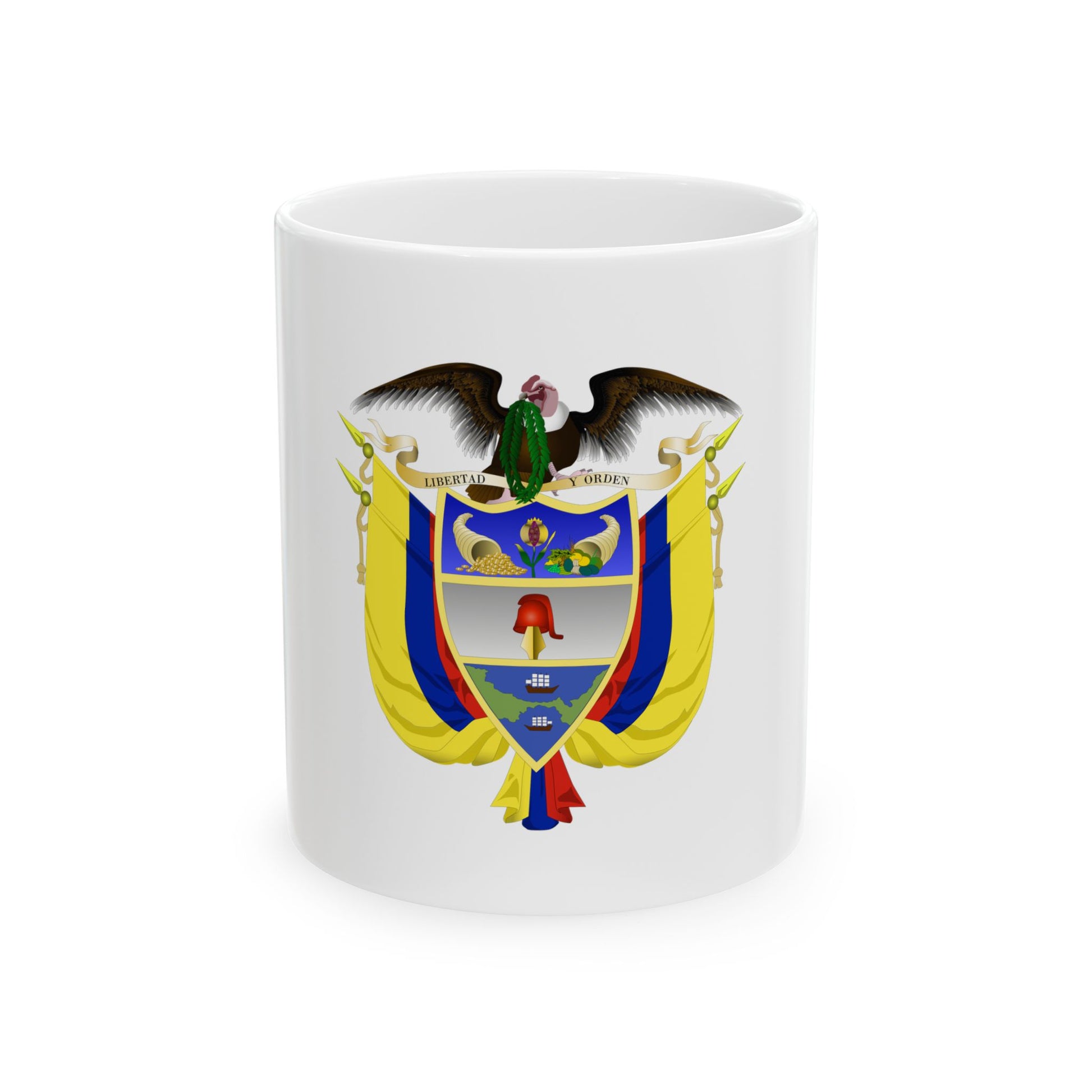 This 5 white coffee mug showcases a vibrant design inspired by the Coat of Arms of Colombia, making it an ideal choice for those who appreciate the country's rich history and culture. The emblem, officially adopted in 1906, is a symbolic representation of Colombia's diverse heritage. The shield features three horizontal stripes - representing the three Andean Indian races - with the topmost stripe colored yellow (for the soil), the middle one blue (for the sea), and the bottom one red (for the blood spilled in the quest for independence). Above the shield, a white scroll bears the country's motto: "Dios, Unión, Libertad" - "God, Union, Liberty." A pair of bicornes (horns resembling ram's horns) flank the shield on each side. The coat of arms is beautifully rendered on this mug, making every sip a celebration of Colombia's heritage.