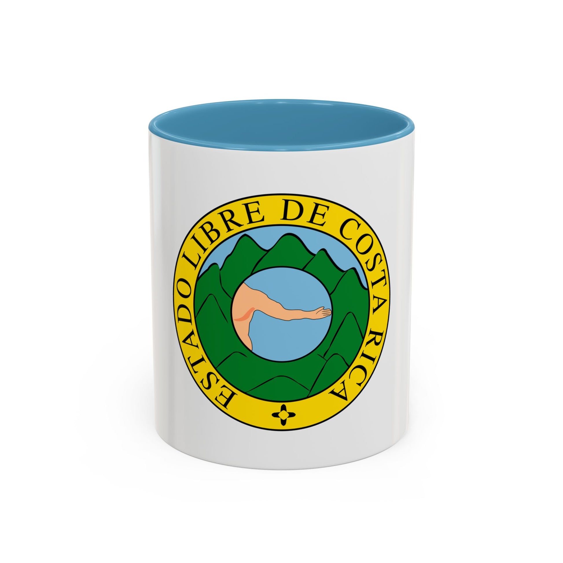 Step back in time with this Accent Coffee Mug featuring the Coat of Arms of Costa Rica from 1824-1840 and 1842-1848. This design showcases a rich historical artifact, embodying the nation's early values and symbolism. The shield is divided into five sections, representing the five provinces of Costa Rica at that time. Each section features unique elements such as volcanoes, coffee plants, and other native flora and fauna. This mug makes a thoughtful gift for history enthusiasts, Costa Rica admirers, or anyone with an appreciation for unique and cool drinkware.