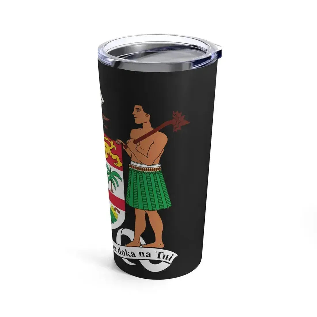 This 20oz tumbler showcases the Coat of Arms of Fiji, a symbol deeply rooted in the nation's history and culture. The design features a shield divided into four quarters, each quarter representing different aspects of Fijian identity. The upper left quarter displays a lion, symbolizing bravery and courage, while the upper right depicts an unadorned Fijian warrior holding a spear, embodying strength and dignity. The lower left showcases a coconut tree, symbolizing peace, prosperity, and fertility, and the lower right displays a ram's head, representing the island of Kadavezu in Lake Ba, a significant historical site. This tumbler is perfect for anyone who appreciates unique and cool drinkware with a touch of cultural history.
