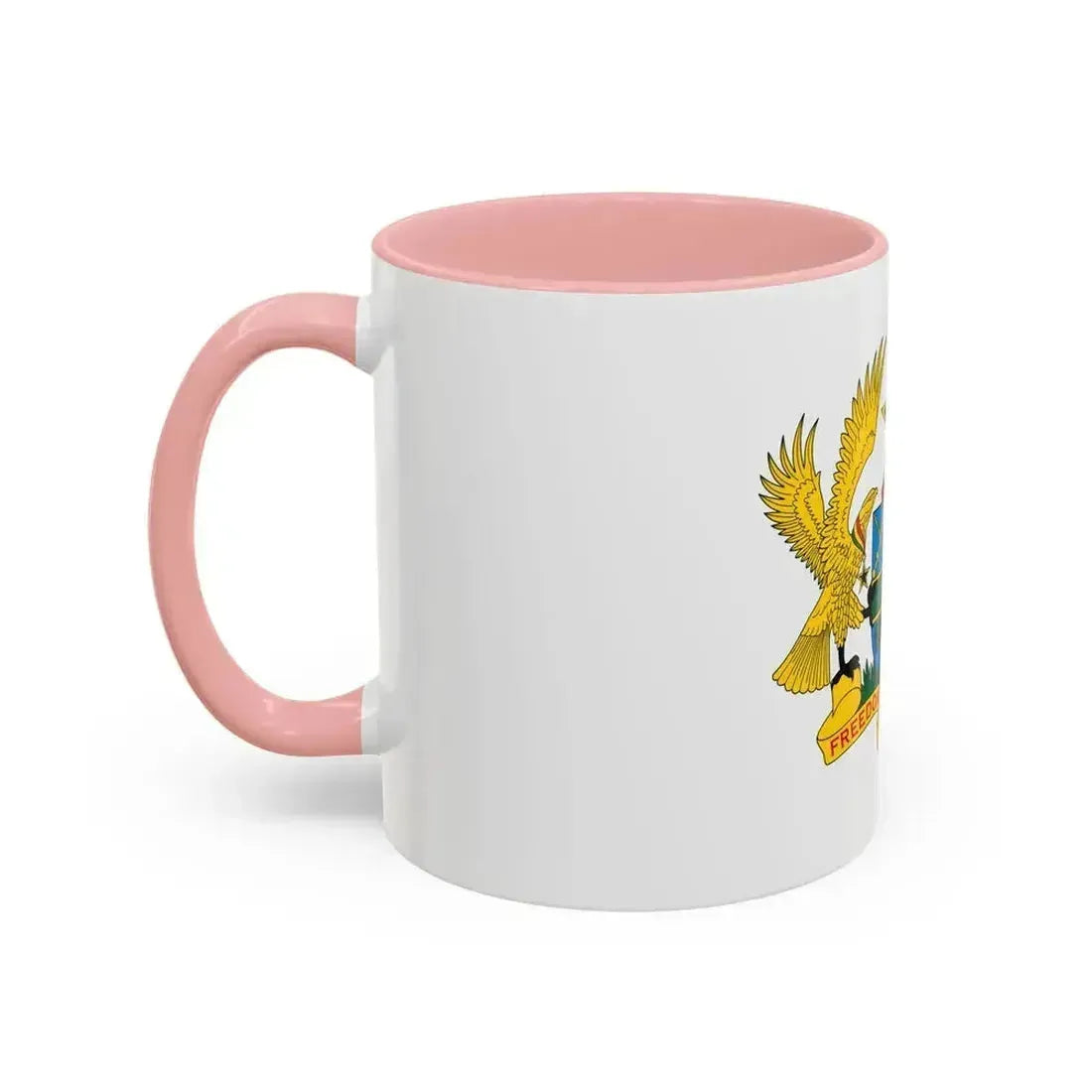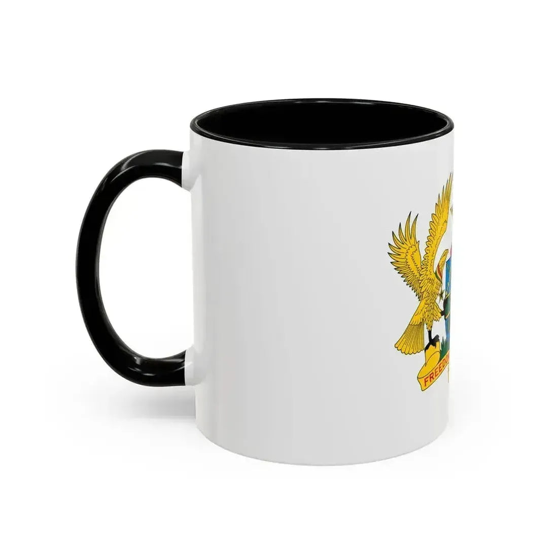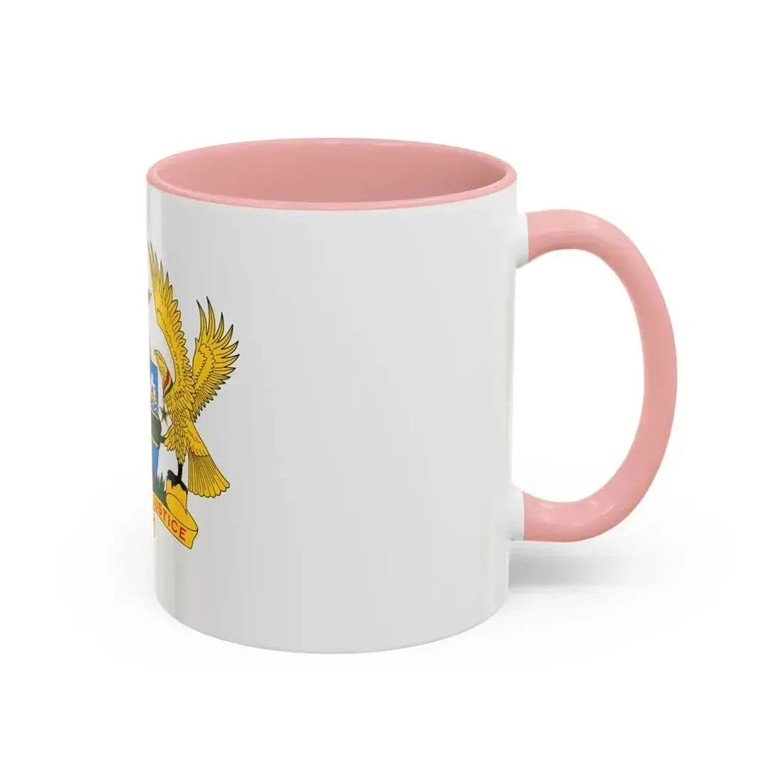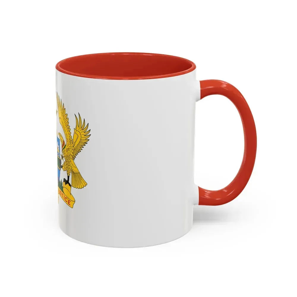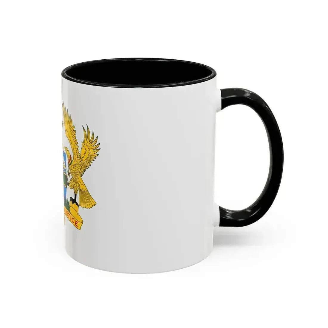 This Accent Coffee Mug features the Coat of Arms of Ghana, showcasing a vibrant representation of the country's rich history and cultural heritage. The design comprises a shield divided into three compartments symbolizing the Akan golden stool, a castle, and a cocoa tree - elements that signify tradition, colonial past, and economic prosperity, respectively. The coat of arms also includes a bald eagle, representing liberty and power, with its wings spread wide. Perfect for anyone who appreciates unique and cool drinkware, this mug is an excellent choice for those interested in West African culture or history enthusiasts looking to add a touch of cultural flair to their daily routine.